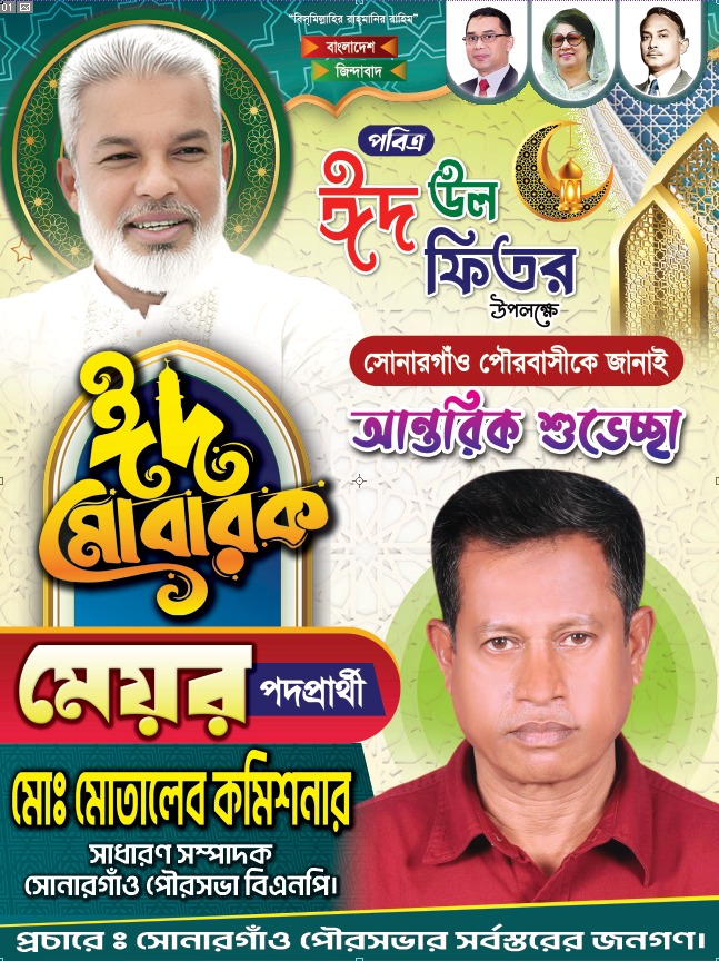 সোনারগাঁ পৌরবাসীকে পবিত্র ঈদুল ফিতরের শুভেচ্ছা জানালেন মেয়র প্রার্থী মোতালেব কমিশনার